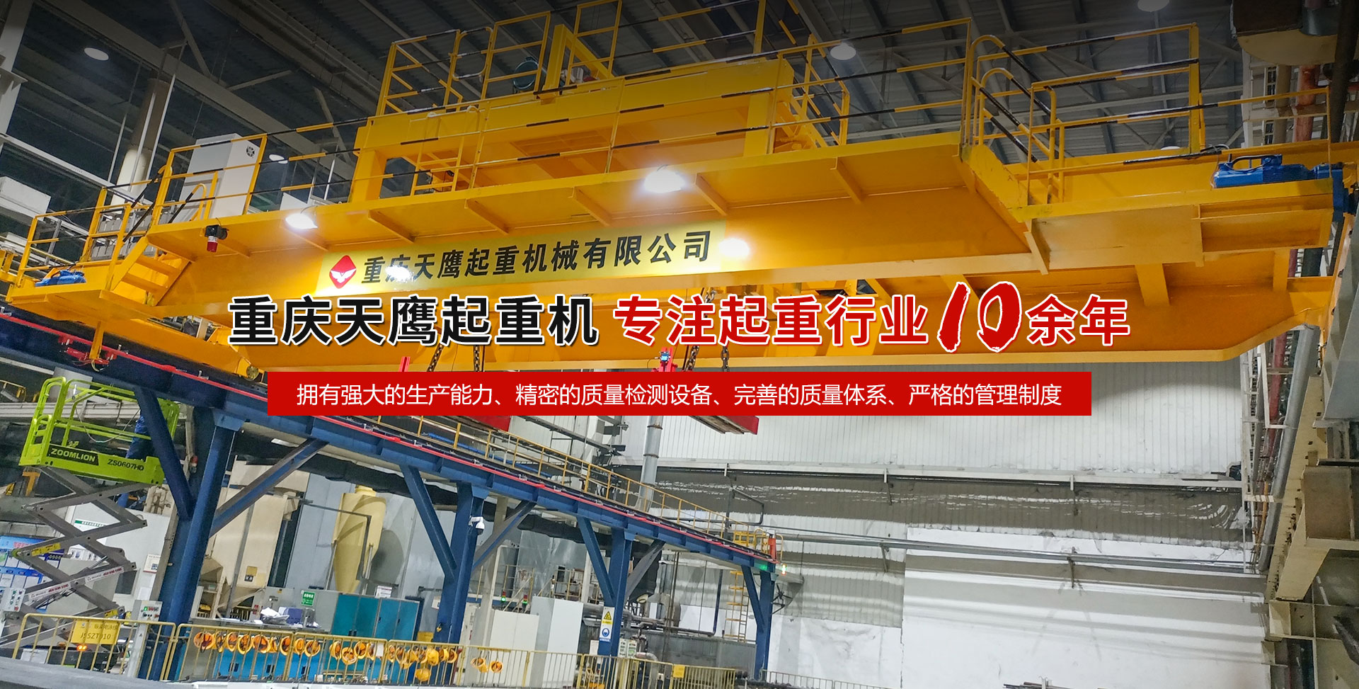 重慶天鷹起重機(jī)械有限公司成立于2014年,主營(yíng)起重機(jī)的銷售、安裝和維護(hù)等相關(guān)服務(wù)。中國(guó)重型機(jī)械工業(yè)協(xié)會(huì)員單位、為中國(guó)工程機(jī)械工業(yè)協(xié)會(huì)工程機(jī)械維修分會(huì)會(huì)員單位及西南地區(qū)起重機(jī)械定點(diǎn)安裝維修單位。具有國(guó)家質(zhì)量監(jiān)督檢疫總局頒發(fā)的特種設(shè)備安裝維修改造質(zhì)格證書(shū)。并率先通過(guò)了IS09001-2000質(zhì)量體系認(rèn)證?! 」咀?cè)資金3000萬(wàn)元;廠房面積2萬(wàn)平方米;各種生產(chǎn)檢測(cè)設(shè)備50臺(tái)套,公司技術(shù)力量雄厚,聘請(qǐng)了國(guó)內(nèi)知名起重機(jī)專家、工程技術(shù)人員擔(dān)當(dāng)項(xiàng)目經(jīng)理、技術(shù)總工程師及顧問(wèn)?,F(xiàn)擁有員工100多人,其中工程技術(shù)人員12人?! ≈鲗?dǎo)產(chǎn)品為各類橋、門式起重機(jī)及輕小型起重設(shè)備,具備生產(chǎn)起重量200t及以下通用橋、門式起重機(jī)的能力,尤其在200t以下起重機(jī)產(chǎn)品上具備較強(qiáng)的市場(chǎng)競(jìng)爭(zhēng)力,為許多行業(yè)設(shè)計(jì)制造了技術(shù)含量高、技術(shù)性強(qiáng)的起重設(shè)備,許多產(chǎn)品在原設(shè)計(jì)標(biāo)準(zhǔn)上進(jìn)行了較大的改進(jìn)、優(yōu)化和創(chuàng)新;其中NH型系列電動(dòng)葫蘆、HD型電動(dòng)單梁處于國(guó)內(nèi)高水平..... 好的產(chǎn)品品質(zhì)需要由較高的裝備水平來(lái)保證,公司購(gòu)買了“大型數(shù)控落地鏜”、“數(shù)控切割機(jī)床”、“自調(diào)式焊接滾輪機(jī)”、“數(shù)顯液壓板料折彎?rùn)C(jī)”、“超大型數(shù)控臥式車床”、“數(shù)控液壓水平下調(diào)式三輥卷板機(jī)”、“單柱移動(dòng)式立式車床”“擁有用于單梁生產(chǎn)的全國(guó)一條拋丸噴漆烘干線、葫蘆噴漆烘干線和全國(guó)較大的100T葫蘆試驗(yàn)臺(tái)和檢測(cè)中心”等各種先進(jìn)的加工設(shè)備,新建廠房面積近2萬(wàn)平方米?! ≠|(zhì)量是企業(yè)的生命,天鷹公司依據(jù)“ISO 9001國(guó)際質(zhì)量管理體系”標(biāo)準(zhǔn),制定并完善了公司的質(zhì)量管理體制。堅(jiān)持質(zhì)量體系的內(nèi)審和外審,將質(zhì)量管理工作落實(shí)到企業(yè)生產(chǎn)經(jīng)營(yíng)的全過(guò)程?! ∧奈⑿?,是天鷹永恒的追求;天鷹的服務(wù),是您首要的選擇!因?yàn)槲覀儓?jiān)信:“誠(chéng)信是本、質(zhì)量鑄就品牌”。為您服務(wù)是我們的榮耀,勤奮而進(jìn)取的天鷹人,時(shí)刻期盼著您的到來(lái)。